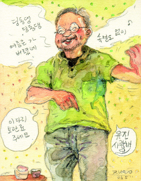 그런데 지내고 보니 이건 즐거운 일만은 아니었다. 같이 술은 먹어도 노예에게 술값을 내라 할 수가 없으니 항상 내가 내야 한다. 뿐만 아니라, -저 주인님, 다리가 좀 안좋은데 치료비 좀 주셔야 겠는데요. 이렇게 나오더니 요즘은 아주 -이 다리 보관료 안 주세요? 한다. 기가 막히는 일이다. 그럼 나는 -내 다리 사용료 내 놔라. 하며 티격태격하다가 -노예해방 시켜주랴? 하면 -아뇨 한다. 이거 아무래도 내가 물린 것 같다…. 이런 차에 얼마전에는 나를 불러 술자리를 베풀고 건강요법을 이야기 해 주고 동석한 국악인에게서 국악을 듣게 해 주고 자신이 노래를 부르는 등 나를 위로해 주었다. 언제나 사람 편하게 해 주는 영호, 전에 일본 만화가 이와미씨와 한국말 일본말 바꿔 공부하기로 약속했다가 지키지 못한 한국 만화가 와이씨인 영호, 아래의 내 그림에 가장 사랑하는 딸 유진이 이름을 쓴 영호, 정많은 영호, 아직도 꿈 많은 영호, 내 다리 건강하게 잘 지키기 바라고 파이팅이다!