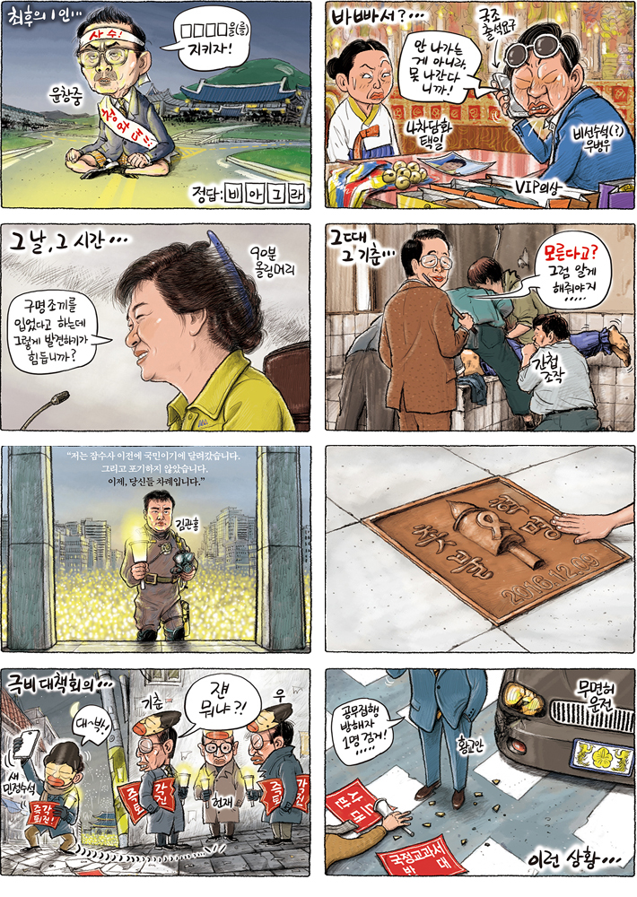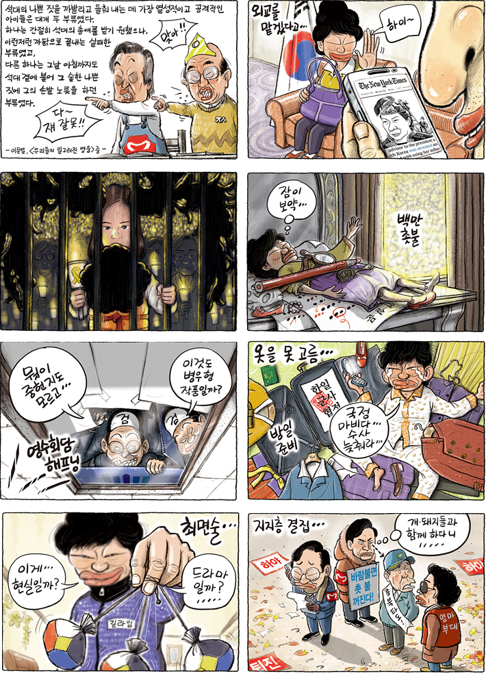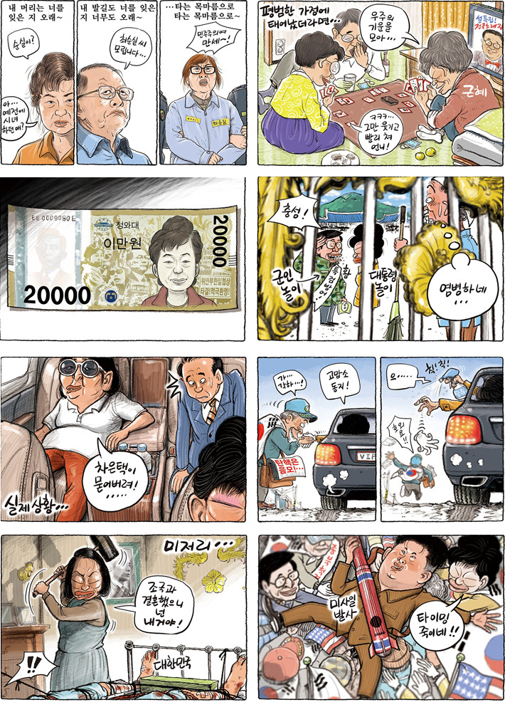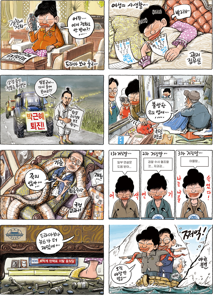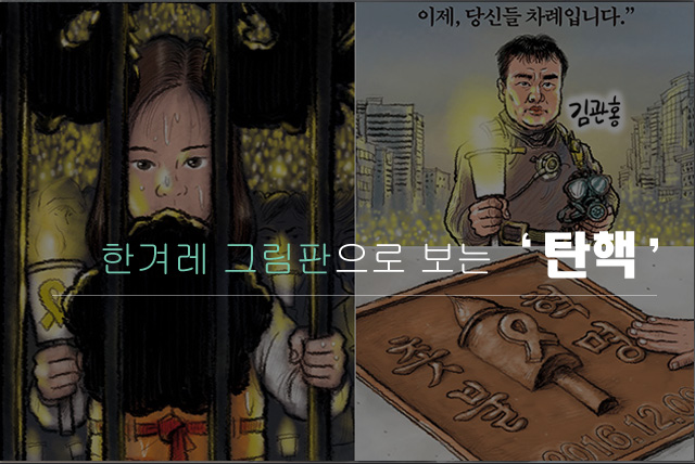 2016년 9월20일 <한겨레>는 숨어 있던 국정농단의 주범 최순실을 찾아 최초 보도하며 ‘박근혜·최순실 게이트’라는 판도라의 상자를 열었다. 그리고 2017년 3월10일, ‘탄핵 열차’는 172일 동안 박근혜 대통령 심판의 날까지 숨가쁘게 달려왔다. 뿌리 깊은 정경유착 민낯이 드러났고, 박 대통령을 비롯해 국가 운영의 책임이 있는 이들의 ‘국민 기만 행위’가 밝혀졌다. 이를 풍자하며 감시해 온 한겨레 그림판을 모아봤다.