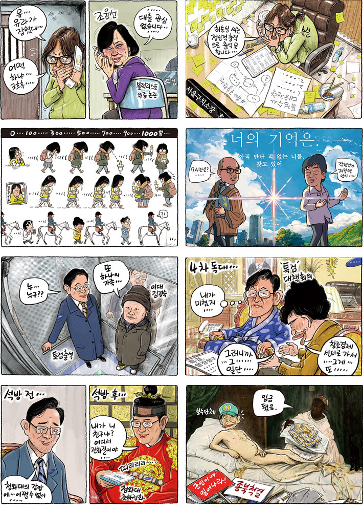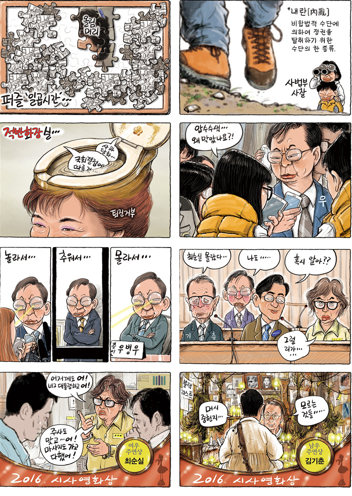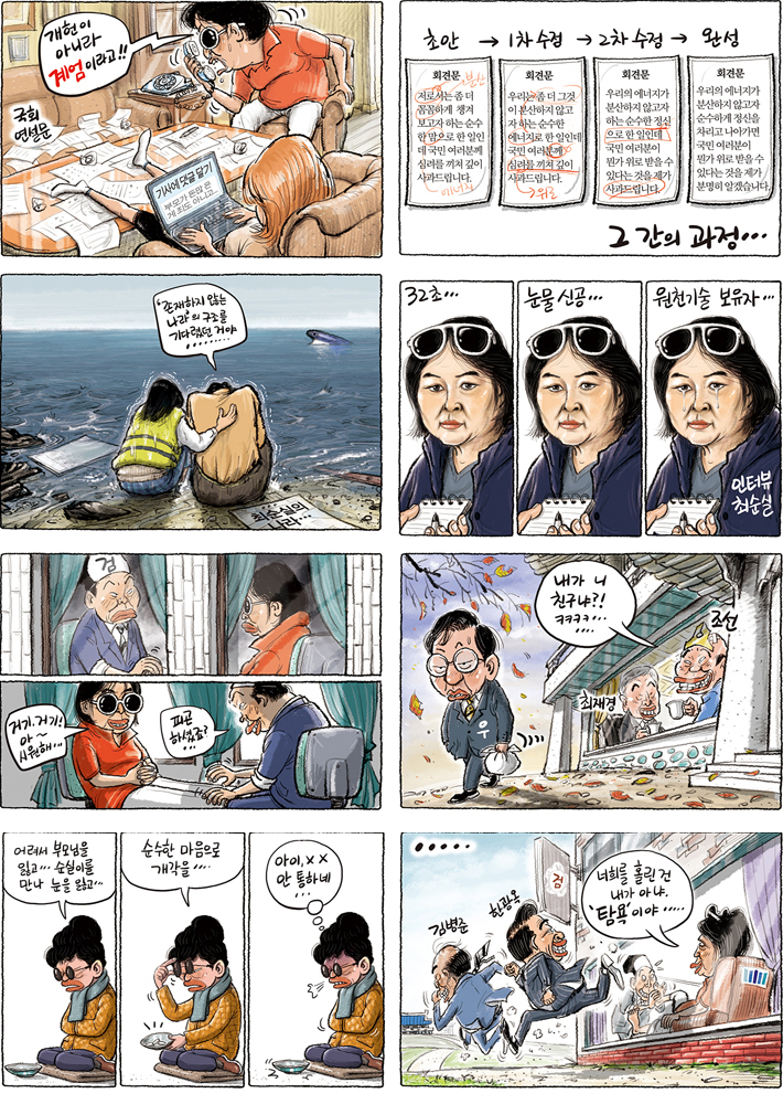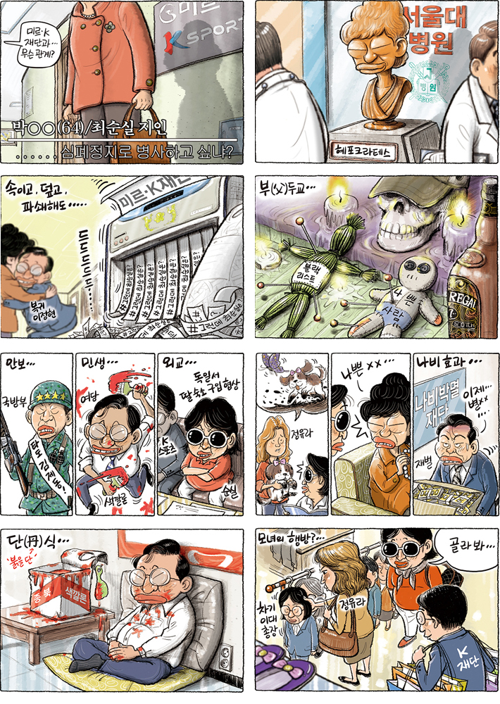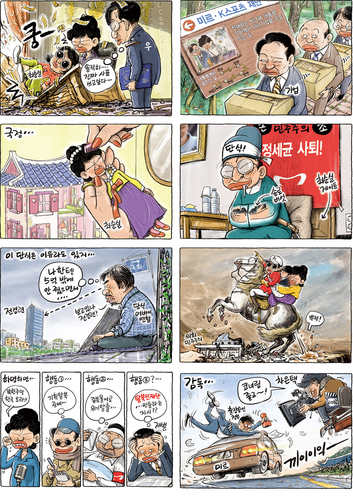 2016년 9월20일 <한겨레>는 숨어 있던 국정농단의 주범 최순실을 찾아 최초 보도하며 ‘박근혜·최순실 게이트’라는 판도라의 상자를 열었다. 그리고 2017년 3월10일, ‘탄핵 열차’는 172일 동안 박근혜 대통령 심판의 날까지 숨가쁘게 달려왔다. 뿌리 깊은 정경유착 민낯이 드러났고, 박 대통령을 비롯해 국가 운영의 책임이 있는 이들의 ‘국민 기만 행위’가 밝혀졌다. 이를 풍자하며 감시해 온 한겨레 그림판을 모아봤다.