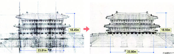 1925년 조선 총독부가 만든 옛 광화문 정면 실측도(왼쪽)과 1968년 복원한 현 광화문 정면 실측도. 지상~용마루 전체 높이와 누각의 좌우 길이 등에서 수치상 거의 차이가 없다. 문화재청 제공