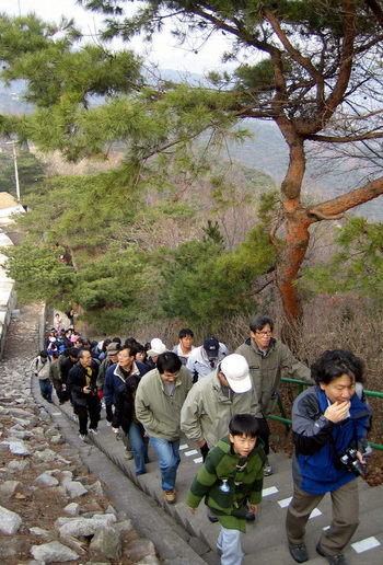 북악산 기슭의 곡장에서 가파른 계단길을 타고 정상을 향하는 답사객들. 솔잎 무성한 노송 아래를 지나고 있다. 앞쪽에 유홍준 문화재청장의 모습이 보인다.