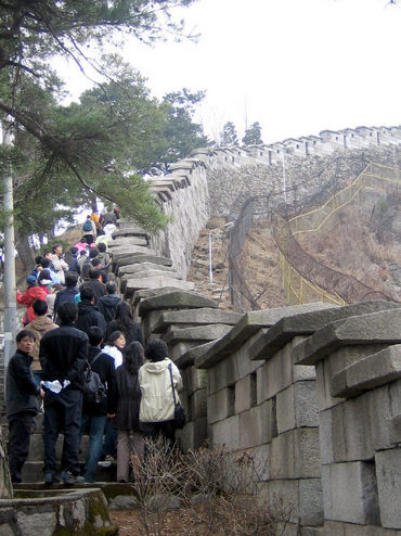 숙정문 다음부터는 한양성 성곽 옆 계단길을 따라 능선을 타고 올라간다. 계단을 통해 성곽길을 올라가던 관객들은 옆의 성곽을 만져보기도 하고 성벽에 뚫린 구멍으로 아련하게 깔린 성북동과 서울 도심부 전경을 디카로 찍느라 여념이 없다. 성곽을 오는 계단 길 곳곳에 경계 근무중인 병사들의 초소와 철조망 등이 따라 이어져 긴장감을 자아낸다. 1968년 1월21일 북한군 특수부대원들이 청와대로 침투하려다 우리 군과 교전할 당시 총탄 흔적이 여전히 남은 `1·21사태 소나무'가 눈길을 끈다. 경치에 빠져 사진을 찍던 등산객들을 군 당국이 가로막는 모습도 종종 눈에 띄었다.