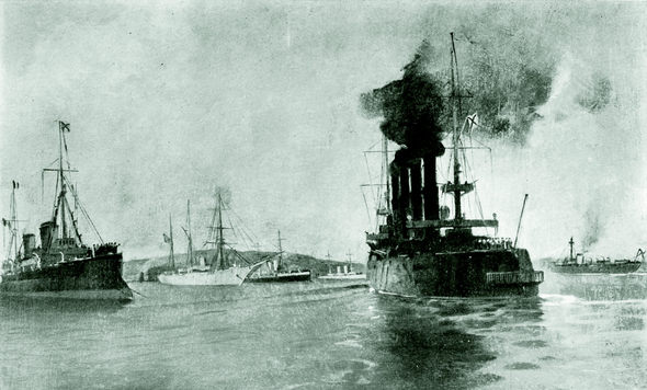 제물포 항을 떠나 일본 함대가 기다리는 먼바다로 가는 카레예츠호와 바랴그호.(오른쪽에서부터) 장갑시설이 전혀 없는 전함인 이 배는 집중포격에 무방비로 노출돼 30분만에 무력화됐다.