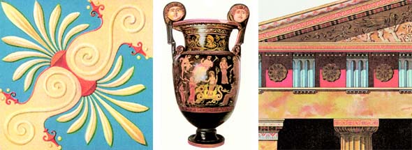왼쪽부터 에트루리아 신전 장식, 아풀라산 적회식 앙포라, 도리스식 신전.