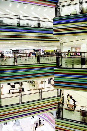 지난 3월말 개장한 갤러리아 백화점 수원점도 고낙범씨의 강렬한 색띠(스트라이프)작업인 ‘뮤즈’로 뒤덮였다. 외부 쇼윈도우 벽면과 엘리베이터 문, 매장 중앙의 공간 벽면, 난간벽면을 비롯해 쇼핑 가방, 사은품 파우치, 컵에 이르기까지 모두 고씨가 디자인한 스트라이프 문양을 쓰는 파격을 연출했다. 백화점 내부가 마치 작가의 캔버스처럼 변한 셈이다. 진동하거나 질주하는 듯한 원색의 스트라이프 색띠들이 물결치는 백화점 구내의 풍경은 배경을 단순명료하게 구성하는 기존 백화점 인테리어의 고정관념을 벗어나 있다. 고씨는 “줄무늬 작업들을 통해 사람, 공간사이의 질서를 새롭게 표상해보고 싶었다”고 말했다. 노형석 기자