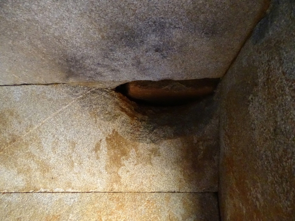 석실 안 북서쪽 모서리의 도굴 구멍. <고려사 절요>에 도굴기록이 남아있어 고려시대 도굴꾼이 뚫은 것으로 추정된다.