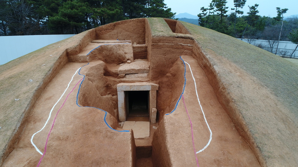 발굴조사 뒤 내부 석실 얼개가 드러난 쌍릉 대왕묘. 치밀하게 판축된 봉분과 정연하게 판석이 맞물림된 구조의 석실 입구가 보인다.