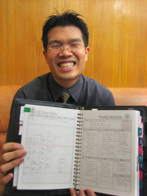 ‘연간, 월/주간, 연락, 인생플랜, 신앙, 지식, 필독서…’ 등 세분화된 텝으로 나뉜 송 주임의 바인더 첫 장을 열자, ‘2005 오브젝티브 액티버티 타임테이블’이라는 영어 제목의 연간 목표가 눈에 들어왔다. 송 주임은 “‘영적, 지적으로 성장하고 성숙하는 2005년’이라는 연간 목표를 세운 뒤 영적, 지적, 신체적, 사회적, 기타 영역별로 세부목표와 실행·측정지표, 시간계획, 평가 항목을 만들었다”며 “20% 밖에 실행하지 못한 목표도 간혹 있지만 대부분 100%에 가깝게 달성했다”고 말했다.