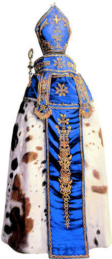 과 개의 몸통에 가톨릭 성직자의 제례복을 입힌 김은진씨의 채색화 <개가죽과 지팡이>.