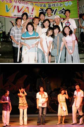성우 정미숙(둘째 줄 가운데)과 팬클럽(misooknet.net) 회원들의 정규모임 모습.(위) 강수진의 팬클럽(fansujin.com)은 지난해 8월 서울 명동에서 ‘여름파티’ 공연을 열고 콩트, 더빙쇼 등을 선보였다. 왼쪽 끝이 강수진. 사진 정미숙 팬클럽·강수진 팬클럽 제공