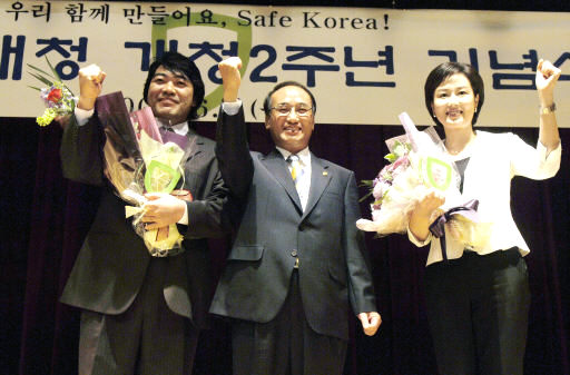 1일 개청 2돌을 맞은 소방방재청 안전홍보대사에 <달마야 놀자> <해신> 등에서 열연한 영화배우 겸 탤런트 이원종(왼쪽)씨와 <한국방송> 기상캐스터 한연수(오른쪽)씨가 위촉됐다.