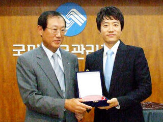 한국방송(KBS) 드라마 〈불멸의 이순신〉에서 열연한 탤런트 김명민(오른쪽)씨가 19일 국민연금 홍보대사로 위촉됐다. 김씨는 현재 국민연금 캠페인 ‘대한민국 기본연금’ 홍보 시에프(CF)에 출연하고 있다.
