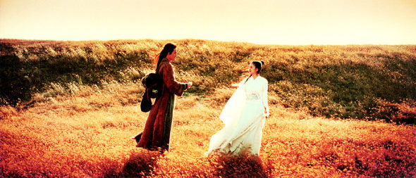 100억원 넘게 들어간 무협팬터지 영화 <중천>(감독 조동오)의 영상미는 높이 살 만하다. 영혼이 49일 동안 머문다는 가상의 공간 ‘중천’을 배경으로 화려한 컴퓨터 그래픽의 향연이 펼쳐진다. 김기철 미술감독을 중심으로 중국의 한충과 우밍 미술감독 등 9명이 뭉쳤다. 전체 장면의 40% 분량인 750컷을 컴퓨터 그래픽으로 꾸며 2006년말 현재 한국영화에서 실현할 수 있는 최상의 그래픽 수준을 보여준다. 제목이기도 한 이 가상 공간 중천은 영화의 중심 무대이자 핵심 개념이다. 이 곳의 모습은 무협영화에서 본듯 익숙하면서도 낯설다. 주인공 이곽(정우성)이 중천에서 처음으로 맞닥뜨리는 마을에는 이층 한옥이 소실점 끝까지 펼쳐진다. 영혼을 정화하는 참선관엔 복숭아 꽃잎이 흐드러져 날린다. 이곽과 소화(김태희)의 사랑이 무르익는 수로마을에는 너른 물 뒤로 산수화처럼 산들이 펼쳐져 있다. 원귀들이 모여 있는 천기관은 붉은색과 검정색이 대비를 이루며 강렬한 인상을 남긴다. 통일신라 말기 왕실 산하 퇴마부대 ‘처용대’ 무사였던 이곽은 원귀들의 반란에 얽혀들어 중천으로 들어가게 된다. 그곳에서 그는 자신 탓에 숨진 연인 연화의 혼령 소화를 만난다. 그러나 소화는 이미 이승에서의 기억을 버리고 해탈해 천인이 됐다. 이곽이 몸담았던 처용대 동료들은 원귀들의 반란을 조정하는 세력이 되어있고, 억울하게 살해된 대장 반추(허준호)는 세상으로 돌아가 복수를 꿈꾼다. 중천을 지킬 열쇠인 영체 목걸이를 지닌 소화는 원귀들에게 쫓기고 이곽은 소화를 지키려고 나선다. 이 영화는 이야기와 볼거리 둘 가운데 후자에 더 무게를 실었다. 중천 세계의 규칙들을 설명하는데 급급해 인물들의 감정선을 치밀하게 좇지 못한 편이다. 인물은 관습적이고 메시지는 보수적이다. 애니메이션 <이상한 나라 폴>의 긴머리 소녀 니나처럼 소화는 애인이 구해주지 않으면 안된다. 이곽이 소화를 구하려고 원귀들의 소굴로 뛰어드는 장면은 장쾌하지만 영화 <영웅>의 한 장면을 떠올리게 한다. 변화를 꿈꾸는 반추는 악인 구실을 한다. 아시아 전체를 겨냥한 이 영화엔 <영웅> 등에 참여했던 일본의 디자이너 에미 와다가 의상을, <신세기 에반게리온>의 사기스 시로가 음악을 맡았다. 정두홍 무술감독이 참여했으며 <영웅> 등 대작의 배경이 됐던 중국 헝디엔서 찍었다. 김소민 기자