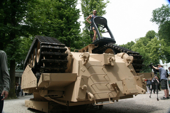 뒤집힌 탱크 위에 달리기 기계를 설치해 미국 체조 국가대표 선수들이 뛰는 설치미술 <전쟁 기계>