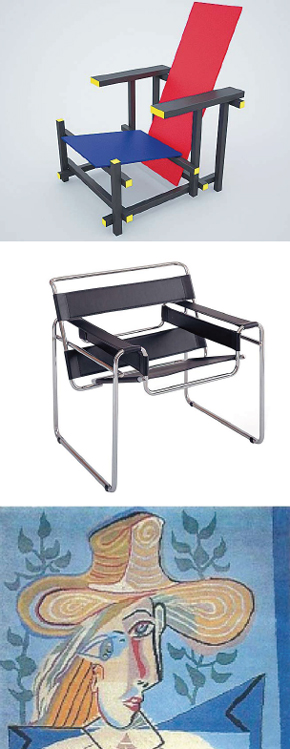 청주공예비엔날레 출품작들. 위부터 디자이너 리트펠트와 브로이어의 의자와 피카소의 직물 공예(태피스트리) 작품 부분.