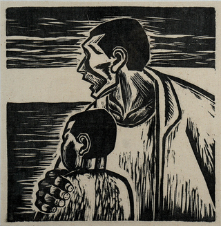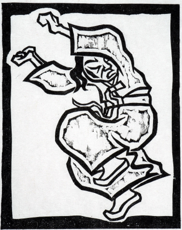 동래학춤 등 다양한 춤 그림 눈길 서울대 조소과를 나와 조각가로 출발한 오윤은 80년대를 풍미했던 목판화를 대표하는 작가다. 그를 비롯해 여러 미술가들이 거친 나무 질감을 살리는 강렬한 표현을 앞세운 목판화를 선보이며 등장했고, 그중에서도 오윤은 날선 풍자와 비장하면서도 해학적인 표현, 한국 전통의 한과 흥을 느끼게 하는 작풍으로 가장 두드러졌던 존재였다. 그러나 그는 오랫동안 간경화를 앓으며 건강이 악화되어 1986년 7월5일 첫 개인전을 마친 직후 마흔 살에 훌쩍 세상을 떠났다. 작가로서 왕성하게 활동한 기간은 몇 년에 불과했지만 남긴 작품들은 우리 현대미술의 보석이 되어 지금도 사랑받고 있다. 이번 전시회에는 대중적으로 가장 널리 알려진 <애비>(오른쪽 사진)를 비롯해 칼을 든 도깨비 작품 등 그의 대표작들이 거의 모두 등장한다. 이번 전시는 물론이고 오윤의 작품 세계에서 가장 중요하게, 그리고 가장 많이 등장하는 소재는 바로 ‘춤’(왼쪽)이다.