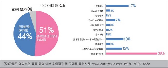 관련분야 전문가들은 “세상이 복잡해질수록 물리적 행복에서 심리적 행복을 추구하는 경향이 크며, 삶의 질에 대한 욕구가 커질수록 탈 스트레스 산업인 명상에 대한 관심과 수요는 늘어 갈 것”이라고 전망했다. 이에 따라 동양의 명상을 기업차원에서 도입하는 사례도 늘고 있다. 혁신, 자유로움, 창의성 등을 외치는 기업의 경우는 더욱 활발하다. 글로벌 NO.1 창의적 기업이라 불리는 A사의 CEO가 꾸준한 명상으로 직관력을 키운다는 일화는 유명하다. 뿐만 아니라 직원의 자율성, 창의성을 중시하는 것으로 유명한 미국인터넷 검색엔진 G사는 회사내에 지압사, 물리치료사뿐만 아니라 명상센터도 가지고 있다. 이처럼 동양의 명상이 ‘삶의 질 향상’과 ‘건강 증진’에 효과가 있다는 사례가 늘면서 다국적기업 직원들의 스트레스 해소와 감정조절, 건강증진 차원에서 적극 활용되고 있다. ◆ 단월드 명상수련 체험자 95% “심신건강에 도움 받았다” 명상에 대한 수요와 관심이 증가하면서 명상의 효과에 대해 궁금증을 가지게 된다. 국내 최대 브레인명상 전문기업 (주)단 월드가 지난 12월 13일부터 20일까지 서울권에 있는 단 월드센터 회원 400명을 대상으로 ‘단월드 명상수련프로그램으로 얻는 효과는?’이라는 설문 조사를 실시했다. 설문결과 ‘생각했던 것 이상의 효과를 얻었다’는 응답자가 51%, ‘원하는 효과를 얻었다’는 응답자가 44%, ‘좀 더 기다려봐야 할 것 같다’가 5%, ‘효과를 보지 못했다’가 0%를 꼽아 ‘생각했던 것 이상의 효과를 얻었다’는 의견이 1위를 차지했다. ‘명상수련 효과를 보았다’는 95%의 응답자가 체험한 효과는 ‘건강·활력증진’이 39%, ‘질병치유’가 17%, ‘심리적 안정과 스트레스·우울감 해소’가 13%, ‘긍정적사고와 감정 콘트롤’이 12%, ‘자신감·성격변화’의 효과를 보았다‘는 응답자가 7%를 차지했다.