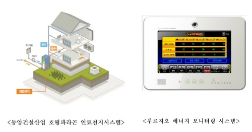 호평 파라곤 테라스하우스는 280.78㎡(구 84형) 규모로, 세대마다 도시가스를 연료로 전기를 생산하고 난방과 온수공급까지 가능한 1kw급 가정용 연료전지 시스템이 설치돼있다. 동양건설산업은 연료전지시스템을 통해 이산화탄소(CO2) 배출량과 에너지 비용을 대폭 줄이는 효과를 가져왔다. 현재 국내 가구당 연평균 이산화탄소(CO2) 배출량은 5,404kg. 연료전지시스템을 이용할 경우 이보다 약 28.5% 줄어든 3,863kg 정도 배출하는 것으로 나타났다. 탄소량을 줄인 효과는 세대 당 연간 어린 잣나무 5,700그루를 심는 것과 같으며, 이는 중형 승용차가 7,100km를 달렸을 때 나오는 CO2 량에 맞먹는다. 그 만큼 환경 친화적인 시스템이다. 또 국내 일반적인 세대가 월평균 700kWh의 전력을 사용한다고 가정할 경우, 연간 약 200만원 정도의 에너지 비용을 줄일 수 있다. 2012년 9월 입주 예정인 대우건설의 부천 소사역 푸르지오는 태양열 등을 이용한 신재생에너지 활용 기술 도입과 실시간 에너지 모니터링 시스템을 선보인다. 태양광 집·채광 시스템, 초절수 3L 양변기, 태양열 급탕 시스템 등으로 냉난방 및 급탕비 등 전력 및 기타 에너지 사용을 줄일 수 있다는 설명이다. 또한, 입주자는 세대별로 설치된 월패드로 실시간 에너지 사용량을 확인할 수 있다. 사용자가 사전에 설정한 사용량을 초과할 경우 경고 메시지를 받을 수 있어 능동적인 에너지 관리가 가능하다는 것이 업체 측의 설명이다. 2012년 초 입주 예정인 수원시 영통구의 '광교 e-편한세상'은 무분별한 에너지 사용을 막을 수 있도록 스마트에코 시스템을 도입한다.