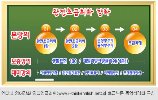기초영어회화 수강생들 사이에서 왕초보 영어 탈출이 가능한 영어 인강(인터넷영어강의) 사이트 띵크잉글리쉬의 인기는 어제오늘 일이 아니다. 이 동영상 영어공부 사이트의 기초영어발음 강좌 '파닉스'는 남녀노소를 불문하는 대표 인기 강좌다. 파닉스 마스터 이후 진행되는 완전초급회화 강좌는 영어말하기의 핵심 강좌로써 일상생활 속에서 영어회화 습관을 길러주고 있다.