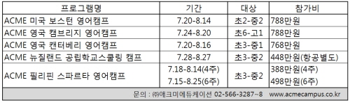 매년 다양한 영어캠프 프로그램을 제공하는 ㈜애크미에듀케이션은 ‘영어 말하기’ 라는 주제 아래 다가오는 여름방학 학생 별 맞춤 영어캠프를 제공한다.
