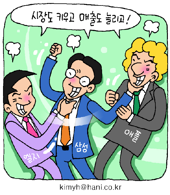 삼성전자가 애플을, 엘지(LG)전자가 삼성전자를 집중적으로 물고 늘어지는 ‘맞수 전략’을 써 시장을 키우면서 매출도 늘리는 1석2조 효과를 톡톡히 보고 있다. 시장 확대와 매출 증가 효과를 보기는 상대방도 마찬가지여서, 상대방도 싫은 내색을 하지 않는 편이다. 대신 이들을 뺀 다른 업체들은 말 그대로 ‘죽을 맛’이다.