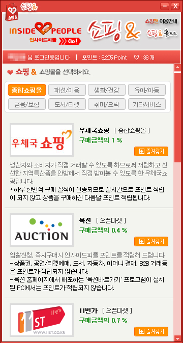 최근 많은 업체들의 할인쿠폰을 지역별로 모아 판매하는 소셜 커머스들이 인기를 끌고 있다. 이러한 열풍은 웹상에서도 지속되고 있는데 단일 업체가 아닌 오픈마켓을 한 곳에 모아놓은 쇼핑프로그램도 등장했다. 인사이드피플의 <쇼핑&>전용프로그램은 옥션, 11번가, G마켓, CJ몰등 주요 오픈마켓뿐만 아니라 AK몰, 이마트몰등 대형 백화점 쇼핑몰까지도 통합하여 원클릭으로 접속하도록 해준다. 그리고 쇼핑몰 결제금액의 최대 5%까지 포인트로 적립하여 VOD를 감상할 수 있는 서비스도 제공하고 있다.