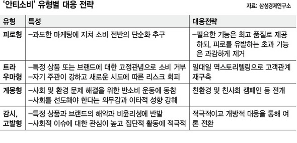 트라우마형은 불쾌했던 경험이나 선입견으로 특정 종류의 제품이나 브랜드 소비를 거부하는 것으로, 화장품이나 정보기술(IT) 제품에서 많이 발생한다. ‘옴니아폰’ 사용자들이 삼성전자의 스마트폰이라고 하면 무조건 거부감을 느끼고, 안드로이드폰 사용자 가운데 절반 이상이 ‘애플이 싫어서’ 아이폰을 사용하지 않겠다고 하는 것 등이 여기에 포함된다. 계몽형은 과소비에 대한 비판과 반성, 감시·고발형은 사회적 이념을 바탕으로 특성 상품이나 브랜드에 대한 소비를 반대하는 특징을 보인다. 기업이 계몽형 안티소비에 대응하기 위해서는 과소비와 자원낭비 문제 해결에 관심을 기울여야 하고, 감시·고발형을 상대로는 소비자 불만의 원인을 찾아 해결하기 위해 노력하는 모습을 보이는 게 필요하다.