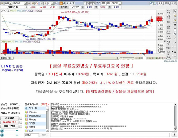 이들은 전문가들의 주식투자정보를 한곳에 모아 공유하고 소통하기 위해 카페를 개설하며 일부 카페들은 투자자들의 입소문을 타면서 회원수가 급격히 불어나고 있다. 투자자들의 요구에 맞게 효율적인 카페운영과 체계화된 정보제공 그리고 전문가들의 영입을 위해 기업의 형태를 갖춘 카페들이 등장하고 있다. 과연 현 주식카페들은 투자자들을 위해 어떤 정보를 제공하고 있을까. TV와 언론에 이미 여러차례 보도되며 유명세를 톡톡히 치르고 있는 A&T 플러스 주식인카페 ( http://www.kospitv.com ) 를 통하여 그 정보를 알아보자. ◆ 투자자들이 원하는 정보를 제공하라. 매매기법,투자교육, 투자강의, 종목추천등 투자자들이 주식시장에 원하는 정보는 수도 없이 많다. 그중 가장 많이 선호하는 것은 현 주식시장에서 수익을 발생시킬수 있는 종목을 추천받는 일이다. 하지만 실상 인터넷에서 그러한 정보를 찾아보면 수익이 날것이다. 또는 숨겨진 재료가 있다 등등 종목에 대한 카더라 통신이 대부분이다. 정보의 신뢰가 떨어진다. 하지만 이곳 주식인카페 에서는 http://www.kospitv.com 그러한 카더라 통신의 불확실한 종목이 아닌 장중 실시간으로 종목을 추천하며 추천종목의 수익과 손실을 정확히 결산내역을 통해 공개를 하고 있다. 종목을 추천할때는 현재시간 몇시 몇분에 어떠한 종목을 얼마에 사야되고 목표가와 손절가는 얼마로 책정해야 하는지 간결하고 명확하게 실시간으로 제시하다보니 투자자들은 앉아서 전문가의 추천종목을 그저 받아보기만 하면 되는것이다. 투자자들이 가장 원하는 정보인 종목추천에 대한 부분을 이곳에서는 말끔히 해결해 주고 있다. ◆ 주식시장 실시간으로 그들과 이야기 하라.