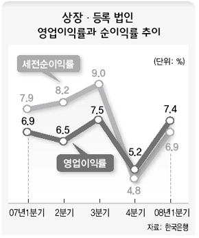 16일 한국은행이 1567개 상장업체를 대상으로 조사해 발표한 ‘1분기 기업경영분석 결과’를 보면 수출 호조 등에 힘입어 매출액 증가율이 지난해 1분기 7.4%에서 올해 18.2%로 크게 높아졌다. 영업이익률도 6.9%에서 7.4%로 개선됐다. 그러나 매출액 대비 세전 순이익률은 원-달러 환율 상승에 따른 외화환산손실 등으로 인해 7.9%에서 6.9%로 하락했다.
