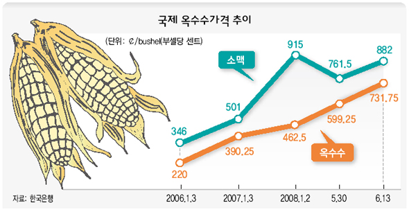 ■ 귀한 몸 된 옥수수 1~2년 전부터 오르기 시작한 옥수수 가격은 올해 들어 더 가파른 상승세를 보이고 있다. 고유가로 옥수수로 만드는 바이오 에탄올 수요가 더 늘어나고 있기 때문이다. 여기에 올해 초 중국까지 곡물 수출을 제한하고 나서면서 기름을 부었다.