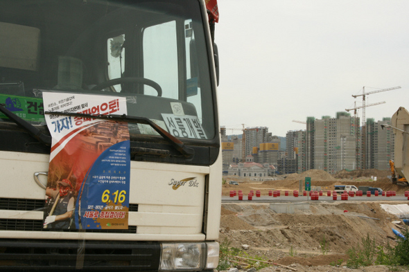 토목 공사 과정에서 나온 수십t의 바위 덩어리와 흙더미는 공사장 밖으로 나가지 못한 채 현장 곳곳에 그대로 쌓여 있었다. 또 큼지막한 총파업 홍보 포스터를 붙인 15t 덤프 트럭 10여대가 현장 한가운데에 멈춰서 있어 파업 현장임을 실감케 했다.