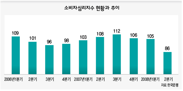 소비심리 얼어붙고 지수 19p 하락 IMF이후 최대폭물가상승 직격탄 저소득층 휘청 물가상승과 고용부진으로 소비자들의 체감 경기가 이미 어두운 불황의 터널로 들어선 것으로 보인다. 한국은행이 이달 2∼13일 전국 30개 도시의 2374가구를 대상으로 조사해 25일 발표한 ‘2분기 소비자동향조사(CSI)’를 보면 경제상황에 대한 소비자들의 심리를 종합적으로 나타내는 소비자심리지수는 올해 1분기 105에서 86으로 19포인트나 하락했다. 이 수치는 2000년 4분기의 86 이후 최저 수준이다. 특히 지수 하락폭은 외환위기 때인 1997년 3분기 101에서 4분기 77로 24포인트 급락한 이후 최대 폭이다. 지수 100 미만은 6개월 전과 비교해 현재 상황이 ‘나빠졌다’고 응답한 소비자가 ‘나아졌다’는 응답자보다 많다는 의미다. 6개 주요 구성지수 가운데 현재 경기판단이 1분기 66에서 2분기 40으로, 향후 경기전망이 96에서 52로 추락해 소비심리가 극도로 위축되고 있는 것으로 나타났다. 현재 생활형편은 81에서 67로, 생활 형편전망은 93에서 72로, 가계 수입전망은 98에서 87로, 소비지출 전망은 113에서 102로 하락했다.