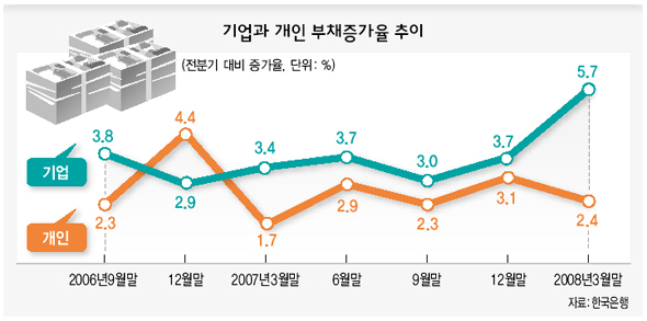 개인 금융부채 1인당 1563만원 경기둔화와 재고증가 등으로 기업 부채 증가율이 5년만에 최고치로 치솟았다. 한국은행이 25일 내놓은 ‘1분기중 자금순환동향’을 보면 기업 부채는 지난 3월 말에 993조2천억원으로 지난해 말의 940조원에 비해 석달만에 5.7%(53조2천억원) 늘었다. 기업부채 증가율(전 분기 대비)은 지난해 3.0~3.7%로 줄곧 3%대를 유지해오다가 올들어 급등했다. 5.7%는 2003년 1분기 관련 통계를 내기 시작한 이래 가장 높은 증가율이다. 이에 따라 기업의 자금부족 규모는 전분기보다 9조원 늘어난 41조9천억원, 자금조달 규모는 전분기보다 45조1천억원 증가한 66조3천억원에 이르렀다. 기업의 금융자산은 823조7천억원에서 808조5천억원으로 줄었다. 박승환 한은 자금순환팀 차장은“기업의 재고가 늘면서 운전자금이 부족해졌다”며 “몇몇 기업들이 인수합병에 나선 것도 부채를 늘리는 요인이 됐다”고 말했다. 개인 부문의 금융자산은 지난해 말 1707조1천억원에서 올 3월말 1709조6천억원으로 거의 변화가 없었다. 반면 개인부채는 739조7천억원에서 757조6천억원으로 2.4%(17조9천억원) 늘었다. 개인 금융자산을 금융부채로 나눈 비율도 2.31배에서 2.26배로 낮아졌다. 이는 주로 주가 하락에 따른 것으로, 개인의 소비여력이 그만큼 위축됐다는 것을 의미한다고 한은은 설명했다. 개인 금융자산을 지난해 말 기준 통계청 추계인구(4845만6천명)로 나눈 1인당 금융자산은 3528만원이었으며, 1인당 금융부채는 1563만원이었다. 1인당 부채는 지난해 말의 1527만원에 비해 소폭 늘어난 규모다. 다만 개인 금융 자산과 부채 통계에는 소규모 개인기업과 민간 비영리 단체 등이 포함돼있어 개인들의 실제 부채 규모는 약간 적을 것으로 예상된다. 한국의 총 금융자산 잔액은 지난해 말 8013조9천억원에서 3월 말 8288조3천억원으로 3.4% 늘어났다. 정부의 자금잉여 규모는 세수 증가로 6조8천억원 늘어난 23조3천억원이었다. 정남기 선임기자