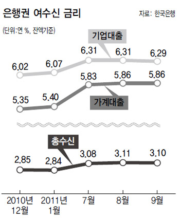 6일 한국은행 통계자료를 보면, 예금 적금 금융채 등 은행들의 자금조달 금리를 반영하는 총수신금리 평균은 지난해 말 연2.85%에서 올해 9월말 3.1%로 0.25%포인트 올랐다. 같은 기간 가계대출 금리는 연5.35%에서 5.86%로 0.51%포인트 올라 수신금리 상승 폭의 2배를 웃돌았다. 기업 대출금리 상승 폭은 0.27%포인트로 수신금리 오름세와 비슷했다.