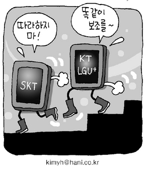 전문가 “관리경쟁의 부작용” 이동통신 시장에서 시장점유율 1위 업체인 에스케이텔레콤(SKT)이 요금을 내리면 2·3위 업체인 케이티(KT)와 엘지유플러스(LGU+)가 마지못해 따라가는 상황이 반복되고 있다. 일반적으로 후발 사업자가 선발 업체를 추월하기 위해 요금을 파격적으로 낮추고 공격적인 마케팅에 나서는 것과 대조적이다. 경쟁이 실종됐다고 볼 수 있다. 케이티는 10일부터 월 5만5000원 이상 정액요금제에 가입한 스마트폰 사용 고객들에게 데이터통화를 무제한 이용할 수 있게 하기로 했다고 9일 밝혔다. 여기서 데이터통화란 휴대전화로 3세대 이동통신(WCDMA)망을 통해 무선인터넷을 이용하는 것이다. 기존 가입자들도 별도의 신청 절차 없이 이용할 수 있으며, 통신망에 과부하가 발생하면 다량 이용자 것부터 차단된다. 에스케이텔레콤은 지난 1일부터 이렇게 하고 있다. 케이티는 며칠 전까지도 에스케이텔레콤의 데이터통화 무제한 이용 허용에 대해 “통신망에 과부하를 일으킬 수 있다”며 부정적인 반응을 보였다. 사장까지 나서서 “통신망에 과부하가 발생할 때는 제한하겠다고 했으니 실제로는 무제한이 아니다” “반쪽짜리 무제한”이라고 헐뜯었다. 케이티는 갑자기 태도를 바꾼 것에 대해 “데이터통화 무제한 허용에 대한 이용자들의 반응이 예상보다 좋은 것으로 나타나 따라갈 수밖에 없게 됐다”고 설명했다. 이에 3위 사업자인 엘지유플러스의 고민이 커지고 있다. 통신망의 특성 때문에 무제한을 외칠 수 없기 때문이다. 이 업체 관계자는 “월 6000원에 1기가바이트 분량의 데이터통화를 주는 오즈 요금제도 사실상 데이통화를 무제한으로 주는 것과 다를 바 없다”고 말했다. 발신자전화번호표시(CID) 서비스 이용료 무료화도 에스케이텔레콤이 2006년 1월에 먼저 하고, 케이티와 엘지유플러스가 새 요금제를 만들면서 시아이디 이용료 항목을 없애는 꼼수를 부리다 이달부터 마지못해 기존 요금제 것을 무료화했다. 음성통화료를 초단위로 계산하는 것 역시 에스케이텔레콤이 지난 3월에 먼저 도입했고, 케이티와 유플러스는 마지못해 오는 12월부터 도입하기로 했다. 이들 업체는 지금은 10초 단위로 계산하고 있다. 이동통신 업체 쪽에서 보면, 음성통화료를 1초 단위로 계산하면 10초 단위로 계산할 때 발생하는 가입자당 월 평균 800원 가량의 ‘낙전수입’을 챙길 수 없게 된다. 이런 상황은 유·무선 결합상품을 놓고도 벌어지고 있다. 에스케이텔레콤이 이동전화 가입자 수에 따라 초고속인터넷과 집전화를 공짜로 쓰게 하는 결합상품을 내놓겠다고 방통위에 인가를 신청하자, 케이티와 엘지유플러스가 “유선통신 시장을 죽이는 행위”라며 반발하고 있다. 하지만 속으로는 에스케이텔레콤의 ‘초고속인터넷과 집전화 공짜’ 마케팅 효과를 퇴색시킬 대응상품을 준비하고 있다. 전문가들은 이를 통신당국의 ‘관리경쟁’ 정책의 부작용으로 꼽았다. 마케팅비 상한까지 제시하는 방통위의 관리경쟁 정책이 이동통신 시장을 후발 업체들이 선발 업체 뒤를 따르며 흉내를 내는 ‘도깨비 놀음터’로 만들었다는 것이다. 그 결과, 이동통신 업체들의 이익과 가계통신비 비중이 함께 커지고 있다.