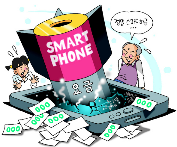 휴대전화를 스마트폰으로 바꾼 뒤 요금청구서를 받고 당황해하는 이들이 늘고 있다. 통계청 조사에서도 지난 2분기에 가계통신비가 전체 지출에서 차지하는 비중이 7.35%(14만2542원)로 최고치를 기록한 것으로 나타났다. 이동통신 업체들은 “스마트폰 사용자가 늘어난 탓”이라고 설명한다. 이용량과 상관없이 월 일정액의 요금을 내야 하는 스마트폰용 정액요금제와 이동통신 업체들의 ‘중복 할인 금지’ 원칙이 만나, 가계통신비 부담을 키우고 있다고 볼 수 있다.
