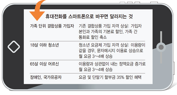 스마트폰은 단말기 자체가 일반 휴대전화(피처폰)보다 비싸다. 따라서 이동통신업체에서 제공하는 보조금 유혹을 떨칠 수 없다. 보조금을 받으려면 스마트폰용 정액요금제에 가입해야 하는데, 이에 따른 대가가 만만치 않다. 우선 가족 단위 결합상품 적용 대상에서 제외되는 게 크다. 가족들의 이동통신 가입 기간에 따라 기본료와 가족 간 통화료를 각각 최대 50%와 100%까지 깎아주는 혜택을 포기해야 한다. 이미 가입돼 있는 경우에도 자동 해지된다. 그만큼 스마트폰 사용자 본인과 가족들의 기본료와 가족 간 통화료 할인액이 줄어, 가계통신비 부담이 커진다.