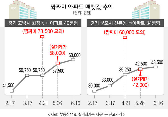 최근 수도권 일대 아파트 단지를 중심으로 주민들의 집값 짬짜미가 기승을 부리고 있다. 그 동안은 반상회 등에서 은밀하게 짬짜미를 논의하는 게 보통이었으나 요즘에는 부녀회가 최저 거래가를 정한 현수막을 내거는 등 그 행태가 대담해지고 있다. 집값 짬짜미는 주택 거래시장을 교란하고 매수자에게 엄청난 재산상 손실을 입힌다는 점에서 부작용이 심각하다. 이에 따라 정부는 짬짜미를 조장한 주민을 처벌하는 방안까지 신중하게 검토 중이다. 짬짜미로 인한 주택시장의 왜곡 현상을 이대로 방치했다가는 집값 상승이 더 확산될 수 있다는 우려 때문이다. 그렇지만 전문가들과 부동산업계가 보는 시각은 조금 다르다. 주민들의 짬짜미는 일시적으로 호가로 끌어올리는 부작용이 있는 게 분명하지만 실제 거래시세에 반영되는 것은 한계가 있다는 것이다. 실제로 최근 집값 짬짜미가 이뤄진 아파트 단지를 살펴보면, 대부분 지역에서 짬짜미로 정한 가격과 실거래 시세는 차이가 큰 것으로 확인되고 있다. 다만, 일정한 가격을 정해 짬짜미가 본격적으로 이뤄진 시점에서는 부동산정보제공업체가 조사한 시세도 동반상승한 것으로 나타나, 호가 중심의 시세에는 일정한 영향을 끼치는 것으로 보인다. 경기 고양시 화정동 ㄷ아파트는 연초부터 산발적인 짬짜미 움직임이 있다가 지난 4월부터 주민들이 구체적인 매도가 가이드라인을 정해 짬짜미를 본격화한 곳으로 꼽힌다. 주민들은 당시 부동산114 시세가 5억750만원(평균)이던 49평형에 대해 2억원을 더 얹은 7억3500만원을 최저 매매가로 짬짜미했다. 이후 이 아파트값은 꾸준히 올라 두달이 지난 현재 부동산114 시세가 6억원에 이르고 있다. 지난달 구청에 신고된 실거래값은 최고 5억8천만원이다. 결국 이 아파트는 짬짜미 이후 매매시세가 두달에 걸쳐 1억원 가까이 올랐다. 하지만 그것은 같은 기간 인근지역 집값이 오른 폭과 비슷한 수준이었다. 현지 ㅅ공인중개사사무소 관계자는 “부녀회의 압력을 받고는 있지만 거래도 없이 인터넷 시세를 올렸다가는 주변 중개업소로부터 ‘왕따’를 당해 영업을 못하게 된다”면서, “담합가격은 커녕 단기간에 급등한 현재 호가 수준에서도 거래가 이뤄지기 어려운 실정”이라고 말했다. 경기 군포시 ㅂ아파트는 주민들이 지난달 34, 38평형을 인근 평촌새도시 수준인 6억~6억5천만원 수준까지 받자고 반상회와 게시물을 통해 짬짜미를 시도한 경우다. 당시 부동산114의 이 아파트 34평형 시세는 4억2500만원이었으나 현재는 1천만원 오른 4억3500만원에 이르고 있다. 또 지난달말 군포시청에 신고된 34평형의 실거랫값은 4억2천만원으로 인터넷 시세와 비슷했다. 이 단지의 경우 거래가 전혀 뒷받침되지 않으면서 짬짜미 영향이 거의 나타나지 않은 것이다. 일선 부동산정보제공업체 시세조사 담당자들은 주민들이 짬짜미한 값이 그대로 시세로 둔갑할 수는 없다고 말한다. 부녀회의 짬짜미가 성공하려면 지역 내 모든 중개업소를 협조자로 끌어들여야 하는데, 그것은 현실적으로 불가능하기 때문이다. 김규정 부동산114 차장은 “정기적으로 시세를 제공하는 중개업소는 한 단지에 한 곳이지만 실제 시세는 현지 다른 중개업소까지 포함해 거래가를 중심으로 체크된다”면서 “부녀회가 끌어들인 특정 중개업소가 시세를 좌지우지할 수 없는 구조”라고 말했다. 최종훈 기자 cjhoon@hani.co.kr