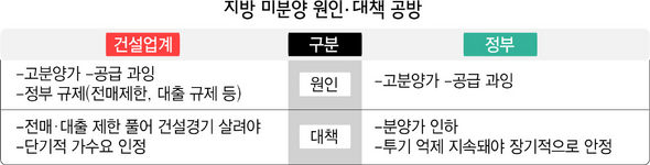 건설업계는 지방 주택시장의 침체 원인을 △고분양가 △공급 과잉 △정부의 전매·대출 제한 같은 규제로 요약한다. 정부는 고분양가와 공급과잉 지적에는 고개를 끄덕이면서도 규제 탓을 하는 것에는 동의하지 않는다. 또 규제 강화는 장기적으로 볼 때 지방 분양시장을 건전하게 만든다고 반박한다. 미분양에 대한 원인분석에 차이가 나는 만큼 해소대책도 서로 다르다. 건설업계는 지방 분양시장이 너무 어려운 만큼 규제를 풀자고 요구한다. 그러나 정부는 분양가가 너무 높아 안팔리는 만큼 값을 내리면 된다고 맞선다. 고분양가·공급 과잉은 공감=한국건설산업연구원은 최근 ‘긴급진단, 지방 주택건설 시장’이라는 보고서에서 지방 주택시장은 경제 규모나 소득수준, 주택보급률 등을 고려할 때 2004년부터 공급 과잉이라고 진단했다. 수요와 공급을 생각하지 않고 마구 짓다보니 아파트가 넘쳐나고 있다는 것이다. 실제로 지방의 주택건설실적은 외환위기 이후 2003년까지 전체 주택건설 물량의 40%대를 유지했으나 2004년 들어 64.2%, 2005년 57.3%로 수도권 물량을 추월했다. 오르기만 한 분양가도 문제다. 울산의 경우 2001년 분양된 현대산업개발의 ‘아이파크’는 평당 400여만원에 불과했으나 2004년 하반기부터 주상복합아파트 건설 붐이 일기 시작하면서 올해는 평당 1300만원대로 치솟았다. 불과 5년 사이에 분양값이 3배 이상 오른 셈이다. 고분양가 원인은 땅을 건설업체가 비싸게 사서 집을 호화롭게 지었기 때문이다. 지역의 땅주인만 돈을 번 셈이다. 건설산업연구원 김현아 부연구위원은 “지방은 인구가 줄고 있는데 집만 많이 지은 것은 업체 책임”이라며 “50~60평형대의 대형 평형만 짓다보니 5억~6억원씩 주고 입주할 수요자가 없어 건설업체들이 어려움에 처한 것”이라고 진단했다. 그러나 그는 “혁신·기업도시 건설, 경제자유구역 지정 등 개발 호재를 있게 한 정부도 책임에서 자유로울 수는 없다”고 덧붙였다. ‘할인 분양’이라도 하라=건설산업연구원은 “이제 정부는 지방 주택경기의 연착륙 방안을 모색해야 한다”고 주장했다. 김 부연구위원은 “지방의 하도급 업체들이 공사대금을 아파트로 많이 받았는데 분양이 안되면 하도급 업체가 가장 먼저 어려울 것”이라고 지적했다. 김학권 세중코리아 대표는 “부산은 미분양이 속출하고 있고 대구는 대형업체들의 계약율도 20~30%에 머믈고 있다”며 “이런 상태로 6개월 정도 가면 업체의 수익률이 마이너스로 돌아서고 내년에는 자금난으로 최후의 수단인 ‘할인 분양’도 나올 것”이라고 예상했다. 따라서 그는 “서울, 수도권은 규제를 계속하더라도 지방은 전매제한, 대출 규제 등을 풀어야 한다”고 주장했다. 지방의 경우 일부 투기 수요가 있더라도 용인해주자는 것이다. 내집마련정보사 쪽은 ‘투기 과열지구 해제’까지 요구하고 있다. 그러나 강팔문 건설교통부 주거복지본부장은 3일 “전매제한 해제 등의 방법으로 투기 수요를 불러오면 고분양가의 폐해만 연장될 뿐”이라며 “이는 진정한 해결책이 아니고 분양가 인하가 정공법”이라고 지적했다. 고분양가로 수요자가 없으면 시장 원리에 따라 ‘할인 분양’ 등으로 활로를 찾아야 한다는 것이다. 허종식 기자 jongs@hani.co.kr