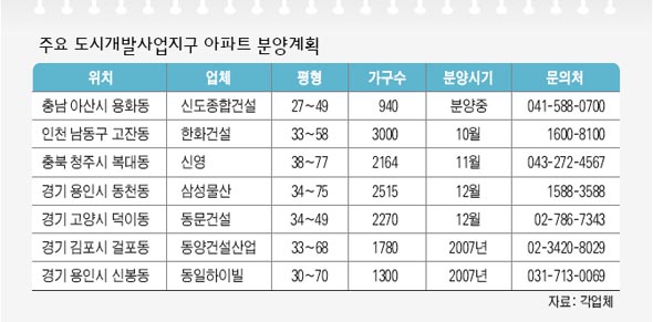 인천·용인 대단지 봇물=연내 수도권에 공급될 도시개발사업지구 아파트 분양물량은 모두 3곳, 7700여가구에 이른다. 이 가운데 인천 논현소래지구와 용인 동천지구가 규모와 입지면에서 경쟁력을 갖춘 것으로 평가된다.