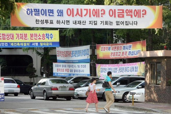 25일부터 시행되는 재건축초과이익 환수에 관한 법률 도입을 앞둔 24일 오후 환수법을 피하기 위해 최근 강남권 재건축아파트들의 관리처분총회가 잇따르고 있는 가운데 서울 서초구의 한 재건축아파트 단지에 관리처분총회 찬반 플랭카드가 난립해 있다. (서울=연합뉴스)