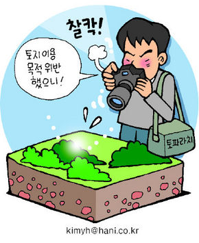 ‘카파라치’(교통 법규 위반 신고)와 ‘쓰파라치’(쓰레기 불법 투기 신고) 등에 이어 땅 투기 현장을 찾아다니며 직업적으로 신고를 하는 ‘토파라치’가 떴다. 경북 경주에서도 최근 한 사람이 3건을 신고해, 150만원의 포상금을 지급받는다.