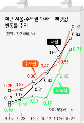 “막차라도 타자” 매맷값 상승률 최고 기록 하지만 최근 아파트 값 상승세가 서울 전역과 수도권으로 번지면서 집 없는 사람들의 불안감이 커지고 있다. 지난 3·30 대책 이후 줄곧 하향 안정세를 보이던 서울 아파트 값은 지난 9월 은평 뉴타운과 파주 운정지구에서 불거진 고분양가 논란을 기점으로 오름세로 돌아섰다. 이후 강북 뉴타운 재정비 촉진지구 무더기 지정을 계기로 상승세가 확산되는 듯 싶더니, 정부의 새도시 건설 계획 발표와 함께 또다시 들썩이는 양상이다. 30일 부동산정보업체인 부동산114 조사를 보면, 지난주 서울과 수도권 아파트 매맷값은 전 주보다 각각 0.83%, 0.92% 오르는 급등세를 나타냈다. 주간 상승률로는 올 들어 최고 기록을 경신했다. 또 스피드뱅크 조사에선, 10월 들어 서울 지역의 아파트 매맷값이 2.26% 상승한 것으로 나타났다. 이는 ‘거품 경고’가 나온 5월 중순부터 9월 말까지 4개월여간의 상승률인 2.36%와 비슷한 수치다. 강동구(4.25%) 송파구(3.83%) 강남구(3.21%) 등 강남권도 10월 상승률이 직전 5개월간의 상승률을 크게 웃돌고 있다. 경기도권의 집값 오름세도 심상치 않다. 10월 한달간 7.91%의 급등세를 보인 구리시를 비롯해 과천(5.91%) 남양주(5.43%), 군포시(5.29%) 등의 집 값 오름세가 가파르다. 분당, 평촌, 일산 등 새도시도 지난 5개월간의 제자리 걸음에서 벗어나 상승세를 타고 있다.
