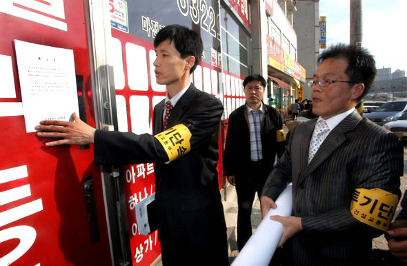 정부와 인천시는 새도시로 지정된 인천 검단지역에 30일부터 무기한 부동산 투기단속에 들어갔다. 이날 오후 건설교통부와 인천시 합동단속반원들이 검단지구내의 한 부동산 중개업소 앞에서 문이 닫혀 점검을 할 수 없게 되자, 추후 방문을 알리는 예고문을 붙이고 있다. 국세청은 31일 새도시 지역에 대해 세무조사를 포함한 투기 대책을 발표한다. 인천/김종수 기자 jongsoo@hani.co.kr