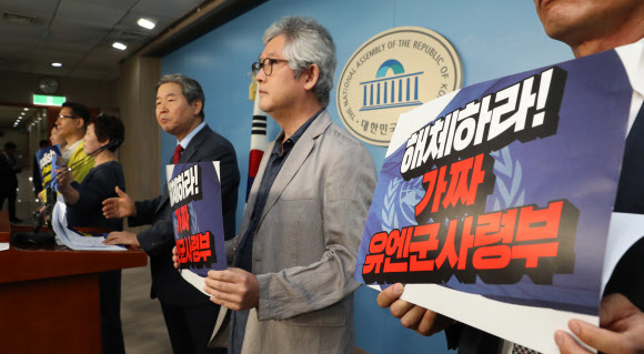 Civic group leaders call for the dissolution of the United Nations Command (UNC) at the National Assembly on Sept. 17. (Yonhap News)