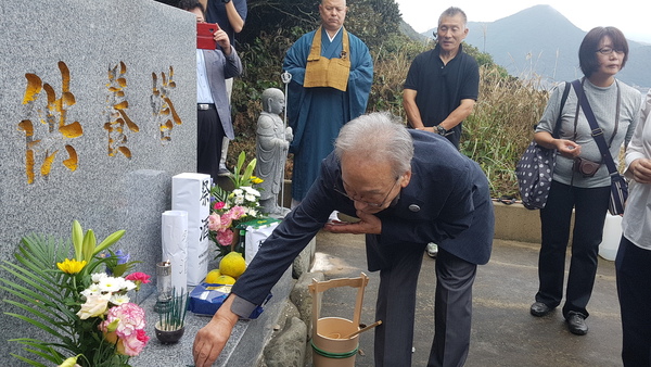 Zainichi Korean poet Kim Si-jong pays respects to the victims of the Jeju Massacre at a memorial tower erected near Sago Bay, Tsushima Island, Japan, on Sept. 29. (provided by the April 3 Hallasan Association)