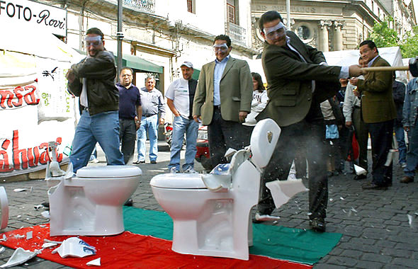 멕시코 국회의원들이 12일 수도 멕시코시티에서 중국산 제품의 밀수입에 항의하며 망치로 중국산 변기를 부수고 있다.