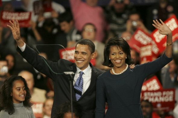 버락 오바마 미 민주당 대선후보가 3일 아내 미셸, 딸 마리아와 단상에 올라 지지자들과 함께 아이오와 코커스 승리를 기뻐하고 있다. AP 연합