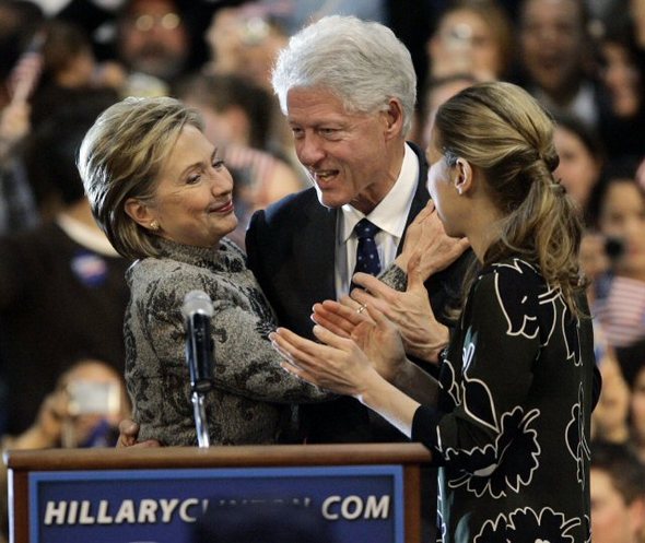 미 민주당 대선주자인 힐러리 클린턴 상원의원인 8일 뉴햄프셔 맨체스터에서 프라이머리 승리를 자축하는 유세에서 남편 클린턴 전 대통령, 딸 첼시와 함께 기뻐하고 있다. AP 연합