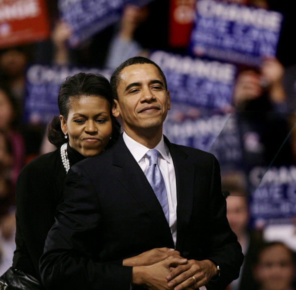 미국 뉴햄프셔주 내슈아에서 8일 밤 지지자들 앞에 선 버락 오바마 민주당 상원의원을 아내 미셸이 뒤에서 안아주고 있다. 내슈아/AP 연합